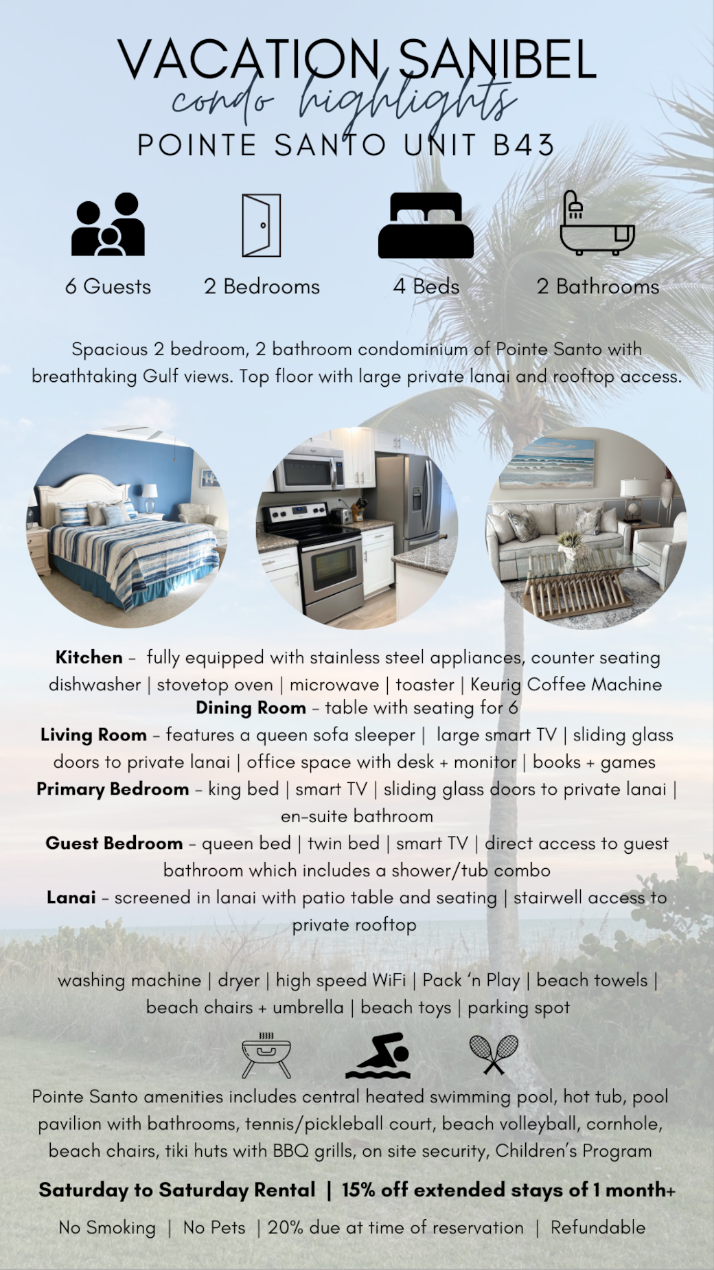 Sanibel Island is back! Our newly remodeled two-bedroom, two-bathroom condo at Pointe Santo is ready to welcome you for an unforgettable getaway. With breathtaking views of the Gulf, beach, pool, and lagoon, this is your chance to experience Sanibel's charm in a whole new light.